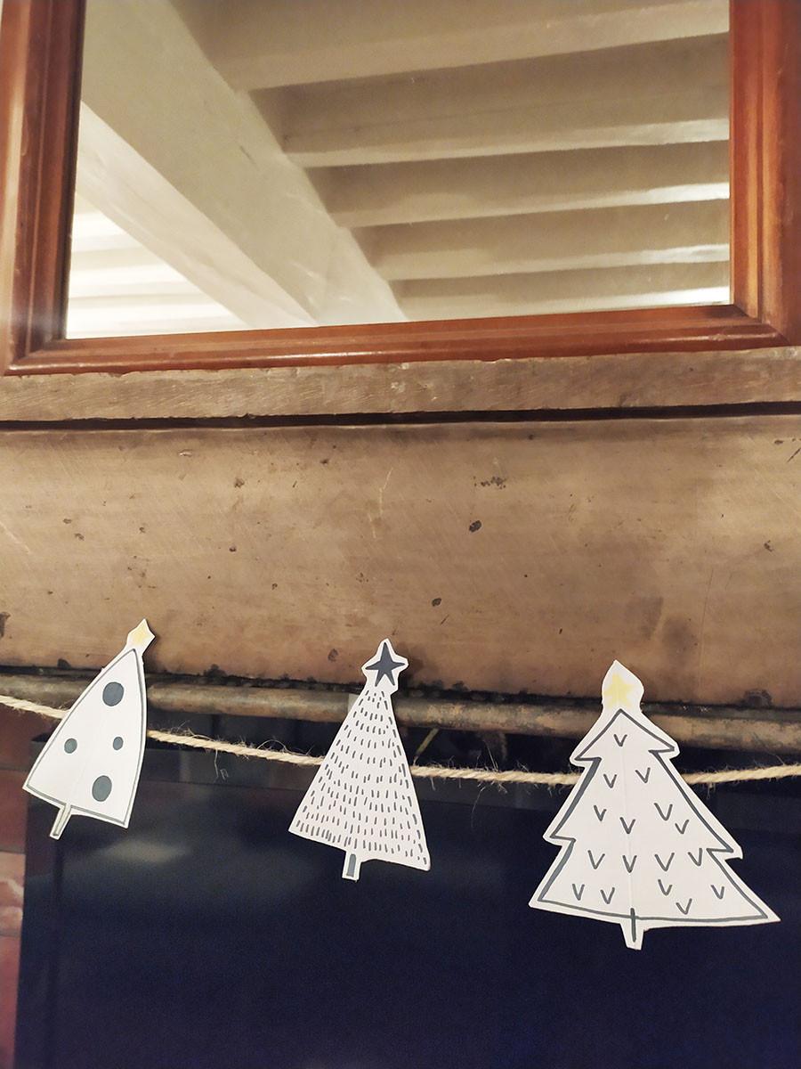 Ensuite j’ai accroché mes petits sapins à une corde puis au-dessus de la cheminée.