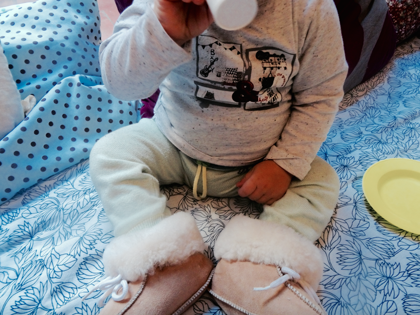 Bébé luciole marche depuis peu mais finit quand même bien souvent à quatre patte. À partir du moment ou il a des chaussettes il veut les enlever. Il tire dessus comme un foufou et bim, la chaussette finit par s’en aller et lui faire un bon en arrière – je vous laisse imaginer cette scène que vous devez toutes connaître ! Il était donc grand temps de lui trouver des beaux petits chaussons. J’ai trouvé mon bonheur sur la boutique. Ils sont ultra mignons, très confortables et bien bien chaud ! J’ai essayé de mettre mon pied dedans mais hélas il n’est point rentré. Mister A a tenté le coup aussi mais force est de constater que ces chaussons sont ceux de bébé luciole. Figurerez qu’il les adore ! Il les garde aux pieds et quand OH malheur un chausson s’en va il essaye de le remettre (c’est pas gagné!). Grâce aux petits ficelles les chaussons restent bien en place et ça c’est top !