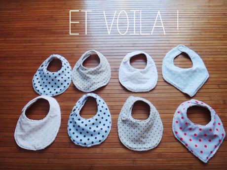 Et c’est parti pour une bonne dizaine de petits bavoirs, bien rangés dans des petites pochettes en tissus matelassé.