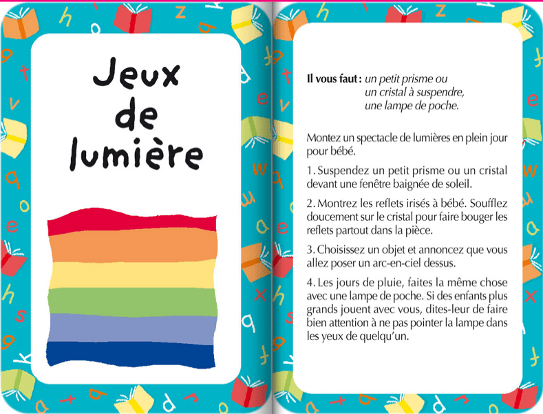Tout d’abord il y a les petites cartes. Il y a une activité par carte. La plupart des activités sont assez simplistes et déjà connues. Mais on y trouve quand même des chouettes activités. Et ça donne pas mal d’idées à développer ! De plus je trouve les cartes très jolies et bébé peut s’amuser avec.