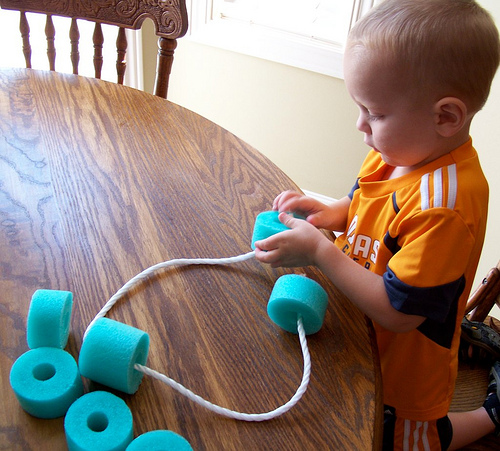 Dans le même genre que les pailles à enfiler mais pour les plus petits : Des boudins de piscine qu’il faudra aussi au préalable découper. Source