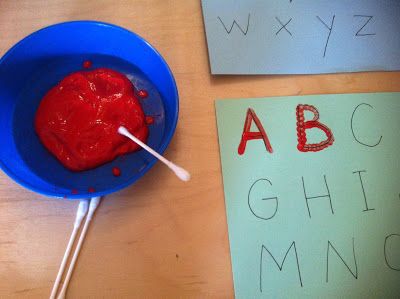 Ça se complique un peu mais c’est tout aussi rigolo ! Voilà une petite idée pour représenter les lettres. De la peinture, des cotons tige et voilà le résultat !
