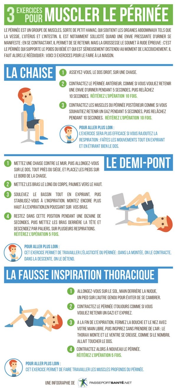Le Perifit à un coût, certes, mais vous pouvez aussi faire différents exercices qui ne demandent aucun support. Voici une infographie super bien faite qui vous indiquera 3 exercices à faire à la maison pour muscler votre périnée !