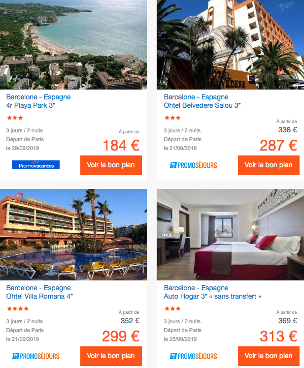 Il existe beaucoup de sites dans ce genre, je vous ai sélectionné l’officiel des vacances qui propose des séjour tout compris pour Barcelone. Vous mettez vos dates, la ville de départ, la ville d’arrivée et le tour est joué. L’équipe du site propose une sélection des meilleurs bons plans voyage avec un rapport qualité-prix imbattable. Tout est mis à jour chaque jour par des experts du voyage ! Voici les petites offres du moment mais je vous invite à farfouiller sur le site pour sélectionner vos dates ainsi que la ville de départ !